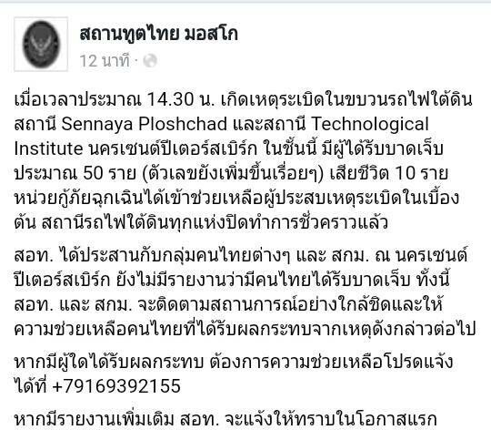 สถานเอกอัครราชทูต ได้ประสานกับกลุ่มคนไทยต่างๆ และ สกม. ที่นครเซนต์ปีเตอร์สเบิร์ก ยังไม่มีรายงานว่ามีคนไทยได้รับบาดเจ็บ ทั้งนี้ สอท. และ สกม. จะติดตามสถานการณ์อย่างใกล้ชิดและให้ความช่วยเหลือคนไทยที่ได้รับผลกระทบจากเหตุดังกล่าวต่อไป หากมีผู้ใดได้รับผลกระทบ ต้องการความช่วยเหลือโปรดแจ้งได้ที่ +79169392155
