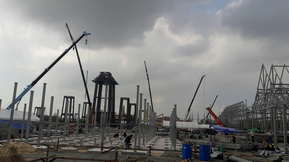 สนามหลวง 4 เม.ย.- งานสร้างพระเมรุมาศคืบหน้า บุษบกประธาน ขึ้นยอดชั้นเชิงกลอนใกล้ครบ 7 ชั้น เร่งดำเนินงานโครงสร้างเสร็จภายในเดือนนี้ พร้อมวางแผนสำหรับช่วงฤดูฝน