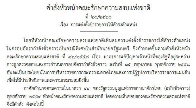 สำนักข่าวไทย 5 เม.ย.-เว็บไซต์ราชกิจจานุเบกษา เผยแพร่คำสั่ง หัวหน้าคณะรักษาความสงบแห่งชาติที่ 20/2560 เรื่อง การแต่งตั้งข้าราชการให้ดำรงตำแหน่ง
