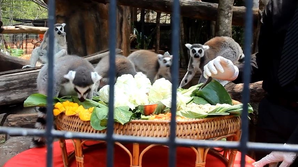 นครราชสีมา 5 เม.ย.- สวนสัตว์โคราชจัดเลี้ยงโต๊ะจีนผลไม้และบุฟเฟ่ต์บาร์บีคิวให้กับลีเมอร์และลิงกระรอกตัวจิ๋ว สร้างสีสันเอาใจน้องๆ หนูๆ นักท่องเที่ยวตัวน้อยที่มาเที่ยวชมในช่วงปิดเทอมใหญ่นี้