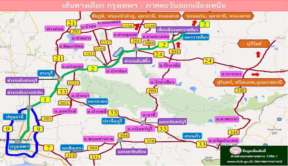 กรุงเทพฯ – ภาคตะวันออกเฉียงเหนือ เส้นทางที่ 1 (กรุงเทพฯ – นครราชสีมา) จากกรุงเทพฯไป อ.วังน้อย (ใช้ทางหลวงหมายเลข 1 ถนนพหลโยธิน) – จ.สระบุรี – อ.ปากช่อง – อ.สีคิ้ว (ใช้ทางหลวงหมายเลข 2 ถนนมิตรภาพ) จากนั้นมุ่งหน้าสู่จังหวัดนครราชสีมา / เส้นทางที่ 2 (กรุงเทพฯ – นครราชสีมา) จากกรุงเทพฯไป จ.สระบุรี (ใช้ทางหลวงหมายเลข 1 ถนนพหลโยธิน) – อ.ม่วงค่อม (ใช้ทางหลวงหมายเลข 205) – อ.ท่าหลวง (ใช้ทางหลวงหมายเลข 2256) – อ.ด่านขุนทด (ใช้ทางหลวงหมายเลข 2148) – อ.ขามทะเลสอ (ใช้ทางหลวงหมายเลข 2068) จากนั้นมุ่งหน้าสู่จังหวัดนครราชสีมา / เส้นทางที่ 3 (กรุงเทพฯ – นครราชสีมา) จากกรุงเทพฯไป จ.สระบุรี (ใช้ทางหลวงหมายเลข 1 ถนนพหลโยธิน) – อ.ม่วงค่อม (ใช้ทางหลวงหมายเลข 205) – อ.ท่าหลวง (ทางหลวงหมายเลข 2256) – บ.บัวชุม,บ.หนองสอง (ใช้ทางหลวงหมายเลข 2234,2247) – อ.ปากช่อง (ใช้ทางหลวงหมายเลข 2422) จากนั้นมุ่งหน้าสู่จังหวัดนครราชสีมา / เส้นทางที่ 4 (กรุงเทพฯ – นครราชสีมา) จากกรุงเทพฯไป จ.นครนายก (ใช้ทางหลวงหมายเลข 305) – อ.บ้านนา (ใช้ทางหลวงหมายเลข 3051, 33) – อ.แก่งคอย (ใช้ทางหลวงหมายเลข 3222) – อ.ปากช่อง (ใช้ทางหลวงหมายเลข 2 ถนนมิตรภาพ) จากนั้นมุ่งหน้า สู่จังหวัดนครราชสีมา