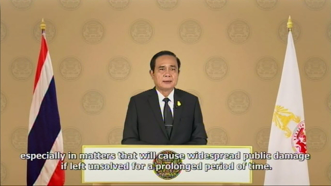 กรุงเทพฯ 7 เม.ย.-นายกรัฐมนตรีและหัวหน้า คสช.แถลงผ่าน ทรท.ประกาศใช้รัฐธรรมนูญฉบับใหม่ หลังโปรดเกล้าฯ พระราชทานรัฐธรรมนูญ เริ่มเดินหน้าสู่การเลือกตั้ง ขณะที่อำนาจตาม ม.44 ยังคงมีอยู่