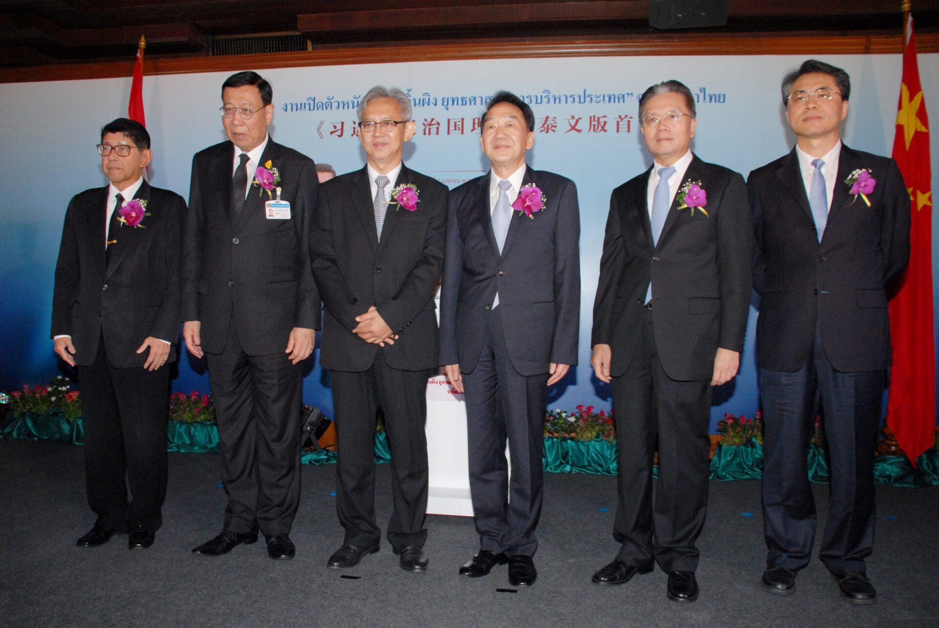 นายเจี่ยง เจี้ยนกั๋ว รัฐมนตรีช่วยว่าการกระทรวงสารนิเทศแห่งคณะกรรมการกลางพรรคคอมมิวนิสต์จีน นายหนิงฟู่ขุย เอกอัครราชทูตสาธารณรัฐประชาชนจีนประจำประเทศไทย พร้อมด้วย นายวิษณุ เครืองาม รองนายกรัฐมนตรี และนายพรเพชร วิชิตชลชัย ประธานสภานิติบัญญัติแห่งชาติ (สนช.) ร่วมเปิดตัวหนังสือ และมีพิธีลงนามว่าด้วยความร่วมมือในการจัดพิมพ์หนังสือสีจิ้นผิง ยุทธศาสตร์การบริหารประเทศ ซึ่งทางสำนักงานสารนิเทศแห่งคณะรัฐมนตรีจีนได้ร่วมกับหน่วยงานรัฐรวบรวมสุนทรพจน์ของประธานาธิบดีสีจิ้นผิง ตั้งแต่ขึ้นรับตำแหน่งจนถึงวันที่ 13 มิถุนายน 2014 เพื่อตอบสนองความสนใจของสังคมโลก ให้โลกได้เข้าใจทัศนคติและแนวทางการพัฒนาประเทศจีน การปราบปรามทุจริต นโยบายความสัมพันธ์ระหว่างประเทศ รวมถึงเส้นทางชีวิตของนายสีจิ้นผิง ซึ่งปัจจุบันหนังสือสีจิ้นผิง ยุทธศาสตร์การบริหารประเทศ เปิดตัวไปแล้วถึง 16 ภาษา พิมพ์จำหน่ายไปแล้วกว่า 6.2 ล้านเล่มทั่วโลก สำหรับภาษาไทย จัดพิมพ์โดยสำนักพิมพ์มติชน