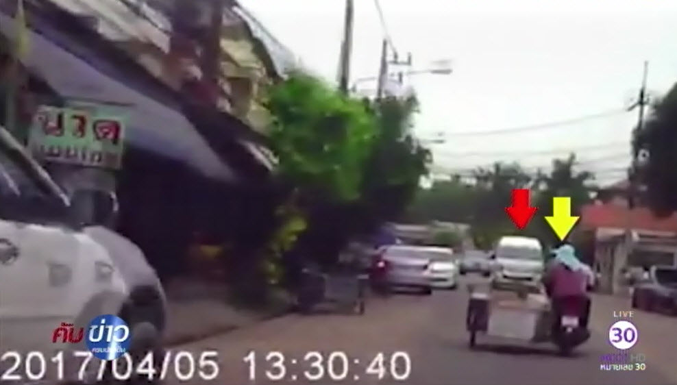 (7 เม.ย.) ในโลกออนไลน์แชร์คลิปวีดีโอจากเฟซบุ๊ก Chumpol Punnin ได้โพสต์ภาพเหตุการณ์เมื่อวันที่ 5 เม.ย. โดยเป็นภาพจากกล้องหน้ารถของรถยนต์คันหนึ่งซึ่งขับตามท้ายรถจักรยานยนต์พ่วง ก่อนจะมีรถตู้คันหนึ่งขับกินเลนชนกับรถจักรยานยนต์พ่วง และยังกระเด็นมาถูกรถเก๋ง ซึ่งผู้โพสต์ได้ระบุข้อความว่า