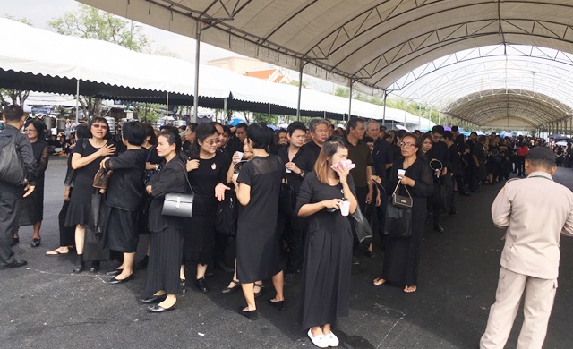 บรรยากาศตลอดช่วงเช้าวันนี้ ยังคงมีประชาชนจำนวนมากหลั่งไหลจากทั่วสารทิศมารอเข้ากราบถวายบังคมพระบรมศพ พระบาทสมเด็จพระปรมินทรมหาภูมิพลอดุลยเดช ทำให้ท้ายแถวยาวไปจนถึงหน้ามหาวิทยาลัยธรรมศาสตร์ โดยส่วนใหญ่เป็นประชาชนที่เดินทางมาจากต่างจังหวัด รวมถึงชาวไทยภูเขาเผ่าต่างๆ ทั้งกะเหรี่ยง ละว้า ม้ง ไทใหญ่ ที่อาศัยอยู่ใน จ.แม่ฮ่องสอน กว่า 100 คน พร้อมใจกันสวมใส่ชุดประจำเผ่าที่ทอขึ้นมาใหม่เป็นสีขาวดำ เพื่อแสดงความอาลัยและสำนึกในพระมหากรุณาธิคุณของพระบาทสมเด็จพระปรมินทรมหาภูมิพลอดุลยเดช ที่ได้มอบอาชีพและชีวิตใหม่ให้กับชาวเขาใน อ.แม่ลาน้อย