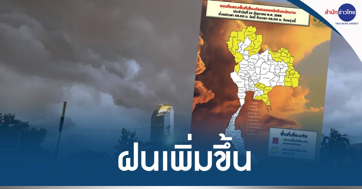 กทม. 24 มิ.ย.-กรมอุตุฯ รายงานภาคเหนือ ภาคตะวันออกเฉียงเหนือ และภาคตะวันออก มีฝนเพิ่มขึ้น และมีฝนตกหนักบางแห่ง ส่วนภาคกลาง และภาคใต้ มีฝนฟ้าคะนองบางแห่ง กรุงเทพฯ และปริมณฑล ฝนฟ้าคะนอง 40% ของพื้นที่