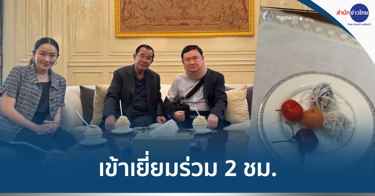 กรุงเทพฯ 21 ก.พ.-“ทักษิณ-ฮุนเซน” ใช้เวลา 2 ชม. พูดคุย-รับประทานอาหารด้วยกันในบ้านจันทร์ส่องหล้า เจ้าบ้านเสิร์ฟเมนูกุ้งแม่น้ำต้อนรับ ด้าน “อิ๊ง” อัปสตอรี่ขนมต้ม-ลูกชุบ “บิ๊กโจ๊ก” โผล่ตรวจความเรียบร้อย
