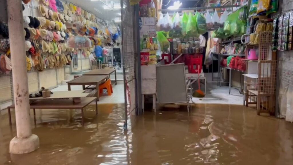 เชียงราย 10 ก.ย.- “แม่น้ำสาย” ระดับน้ำเพิ่มสูงขึ้นต่อเนื่อง จากอิทธิพล “พายุยางิ” ฝนตกหนัก น้ำทะลักเข้าท่วมตลาดสายลมจอย ผู้ค้าเร่งเก็บของหนี