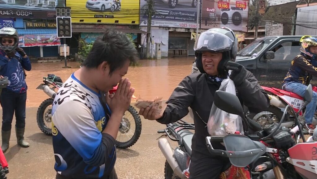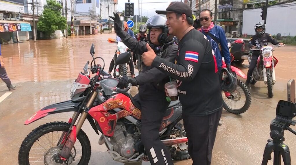 เชียงราย 13 ก.ย. – อาจารย์เฉลิมชัย โฆษิตพิพัฒน์ ศิลปินแห่งชาติ ขี่มอเตอร์ไซค์คู่ใจ ตระเวนให้กำลังใจชาวเชียงราย พร้อมมอบเงินให้กับเหล่ากู้ภัย ใช้เติมน้ำมันเจ็ตสกี ไว้คอยช่วยชาวบ้าน