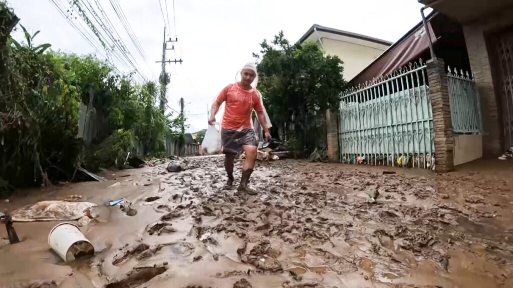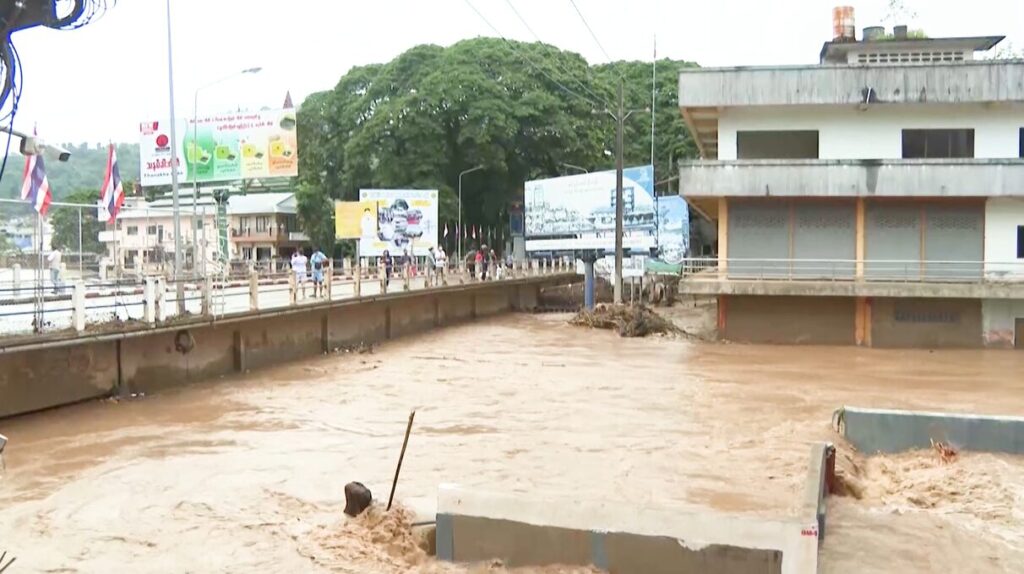 ตลอดช่วงเช้าที่ชายแดนแม่สายมีฝนตกลงมาอย่างหนัก แต่ยังไม่ส่งผลทำให้น้ำเพิ่มมากนัก น้ำที่ท่วมชุมชนชายแดนแม่สายลดลงต่อเนื่อง อย่างด้านหลังผม คือถนนที่จะเข้าไปยังชุมชนเกาะทราย ชุมชนไม้ลุงขนและชุมชนเกาะสวรรค์ ซึ่งเคยถูกน้ำท่วมสูงเกือบ 1 เมตรตอนนี้สามารถเดินเข้าออกได้แล้ว แม้จะยากลำบากเพราะเต็มไปด้วยโคลน และยังมีบางจุดที่ยังมีน้ำไหลเชี่ยวซึ่งต้องใช้ความระมัดระวัง และชาวบ้านหลายพันคน ที่ถูกน้ำท่วมสูงหลายวัน ยังเดือดร้อนหนัก โดยเฉพาะโคลนที่ท่วมสูงบางหลังถูกโคลนท่วมสูงเกือบ 2 เมตร โดยตอนนี้น้ำในลำน้ำสายที่กั้นชายแดนไทย-เมียนมา ลดลงเกือบ 1 เมตรจนเริ่มเห็นพนังกั้นน้ำแล้ว ทำให้น้ำที่ท่วมทั้งฝั่งไทยและเมียนมาลดลง ทำให้ชาวเมียนมาในฝั่งท่าขี้เหล็ก ซึ่งเจอน้ำท่วมหนักเหมือนกัน เดินข้ามด่านชายแดนเข้ามาซื้ออาหารในฝั่งไทยทั้งหมูเห็ด เป็ดไก่ ผักผลไม้ต่างๆ เพราะในฝั่งท่าขี้เหล็ก ซึ่งถูกน้ำท่วมสูงมาหลายวัน ขาดแคลนอาหารอย่างหนัก หลังน้ำเริ่มลดลงชาวบ้านในฝั่งเมียนมาจึงข้ามฝั่งมาซื้ออาหารจำนวนมาก