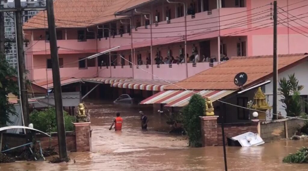 พะเยา 17 ก.ย.-ระทึกช่วงเช้ามืด น้ำป่าหลากท่วมชุมชนหน้ามหาวิทยาลัยพะเยา อ.เมือง จ.พะเยา ซึ่งเต็มไปด้วยหอพักนักศึกษา น้ำทะลักท่วมรวดเร็วไม่ทันตั้งตัว ล่าสุดลดระดับลงแล้ว แต่ทิ้งความเสียหายเป็นบริเวณกว้าง โดยเฉพาะรถยนต์และมอเตอร์ไซค์หลายร้อยคัน