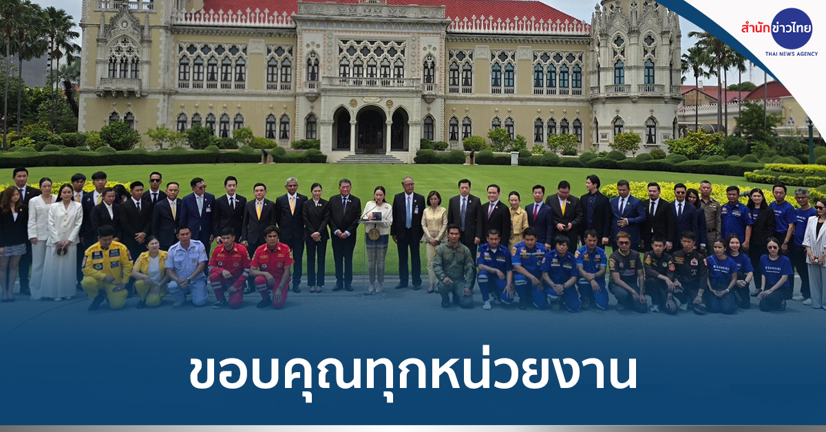 จากนั้นนายกรัฐมนตรี ได้ถ่ายรูปกับหน่วยงานต่างๆ บริเวณสนามหญ้าหน้าตึกไทยคู่ฟ้า พร้อมกล่าวขอบคุณหน่วยงานภาครัฐ ภาคเอกชน จิตอาสา และอีกหลายหน่วยงานที่เข้ามาไม่หยุดหย่อน ทำให้เห็นว่าประเทศของเรา บนภัยพิบัติต่างๆ ก็ยังมีความโชคดี ที่คนไทยมีน้ำใจซึ่งกันและกัน แล้วก็ช่วยเหลือซึ่งกันและกันมาตลอด วันนี้รัฐบาลขอทำหน้าที่เป็นผู้ประสานพลัง ประสานใจ ของประชาชนทั้งประเทศ วันที่มีวิกฤติก็ขอให้กำลังใจซึ่งกันและกัน ไม่ว่าจะเป็นภาคส่วนใด ตอนนี้เชียงรายเรื่องน้ำท่วมลดน้อยลง แต่มีปัญหาดินโคลนถล่ม ฝ่ายความมั่นคงและทุกหน่วยงานเข้าไปช่วยเหลือ ภาคเอกชนที่มาก็จะนำสิ่งของไปช่วยพื้นที่ประสบภัย ตามจุดต่างๆ ไม่ว่าจะเป็นสุขากระดาษ ไม้กวาด อาหารแห้งต่างๆ ตอนนี้ที่เชียงรายมีโรงครัวทำอาหารสดๆ ทุกวัน แต่การมีอาหารแห้งของภาคเอกชนส่งไปให้ด้วย เมื่อเหตุการณ์ดีขึ้น อาหารเหล่านี้จะใช้ต่อได้ในอนาคต แล้ววันนี้ที่เรามารวมกัน นับเป็นภารกิจที่ทุกคนร่วมมือร่วมใจ อยากจะเร่งเยียวยาให้พี่น้องประชาชนที่ประสบภัย มีความทุกข์ให้สั้นที่สุด เราจะช่วยทุกฝ่าย กำลังพลที่ประสานมาก็ได้ประสานทั้งหมด อย่างที่แจ้งมาว่า เชียงรายรถติดขัด ตอนนี้ตำรวจเข้าไปดู ทำให้การเดินทางง่ายขึ้น