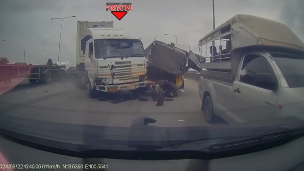นาทีกล้องหลังรถคันหนึ่งบันทึกภาพไว้ได้ ตอนแรกจะเห็นว่ารถชะลอต่อแถวอยู่บนทางด่วนกาญจนาภิเษก ช่วงลงจากสะพานข้ามแม่น้ำเจ้าพระยา แต่ไม่นานปรากฏว่ามีรถบรรทุกพ่วง 22 ล้อ บรรทุกตู้คอนเทนเนอร์ เหมือนขับเบียดซ้ายลงมาจากสะพานข้ามแม่น้ำด้วยความเร็ว จากนั้นรถมีลักษณะเบรกไม่อยู่ พุ่งชนท้ายรถหลายคันที่จอดต่อแถวกันอยู่ จนรถที่ถูกชนกระเด็นไปชนคันหน้าต่อๆ กัน กระทั่งรถบรรทุกพ่วงไปชนท้ายรถพ่วงที่จอดอยู่ด้านหน้า ทำให้รถที่เบรกแตกเสียหลักเบี่ยงกระเด็นข้ามถนนอีกเลน รถกระจัดกระจายเกลื่อนทางด่วน และแม้ความเร็วรถที่พุ่งชนจะถูกเบรกไว้ได้ แต่ยังไหลเลื้อยต่อไปอีกเล็กน้อย