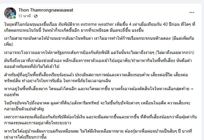 ล่าสุด ดร.ธรณ์ โพสต์ว่า ในยุคที่โลกร้อนรุนแรงขึ้นเรื่อย ภัยพิบัติจาก extreme weather เพิ่มขึ้น 4 เท่าเมื่อเทียบกับ 40 ปีก่อน ที่ใดๆ ที่เกิดผลกระทบในวันนี้ วันหน้าก็จะเกิดขึ้นอีก ยากที่จะหนีรอด มีแต่จะถี่ขึ้น แรงขึ้น จึงถึงเวลาที่เราต้องช่วยตัวเอง หลีกเลี่ยงการพาตัวเองเข้าไปอยู่อาศัย/ทำมาหากินในพื้นที่เสี่ยง นั่นคือคำตอบสำหรับคนที่ยังไม่ได้เข้าไป