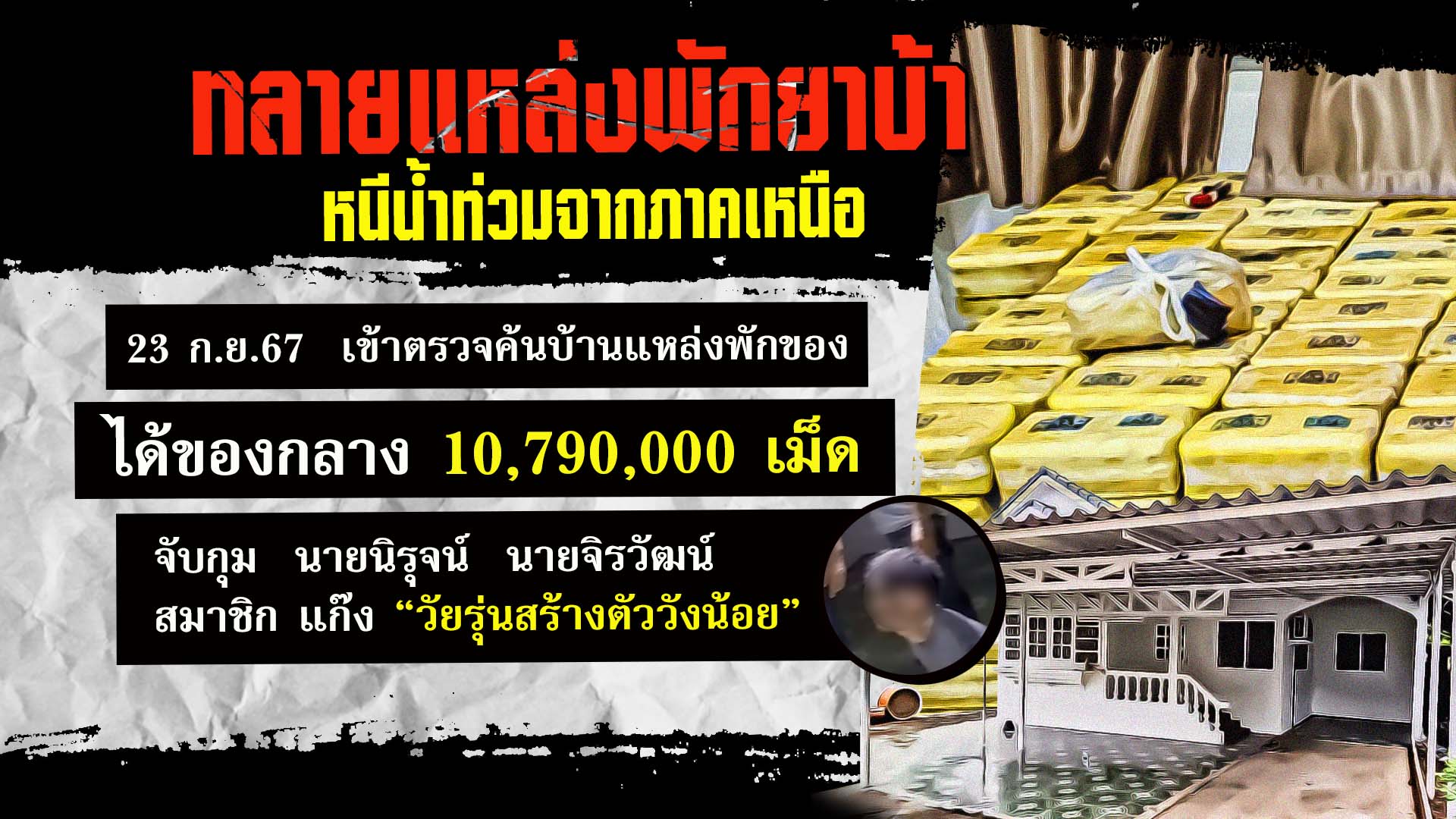 ที่มาที่ไปของการบุกจับกุมครั้งนี้ สืบเนื่องมาจากเมื่อวันที่ 24 สิงหาคมที่ผ่านมา ตำรวจและทหารได้บุกตรวจค้นโกดังแห่งหนึ่ง ในพื้นที่ อ.บางบัวทอง จ.นนทบุรี หลังสืบทราบว่าเป็นแหล่งพักยาเสพติดที่ลำเลียงมาจากภาคเหนือ ยึดยาบ้าได้ 1.8 ล้านเม็ด และมีข้อมูลว่า นายนิรุจน์ อายุ 29 ปี เป็นคนรับยาเสพติดมาเก็บไว้ และมีเพื่อนร่วมแก๊งอีกคน คือ นายจิรวัฒน์ อายุ 40 ปี ทำหน้าที่เป็นต้นทางคอยสังเกตเจ้าหน้าที่ ก่อนจะนำยาเสพติดส่งให้ลูกค้า ซึ่งทั้ง 2 คน อยู่ในแก๊ง “วัยรุ่นสร้างตัววังน้อย”