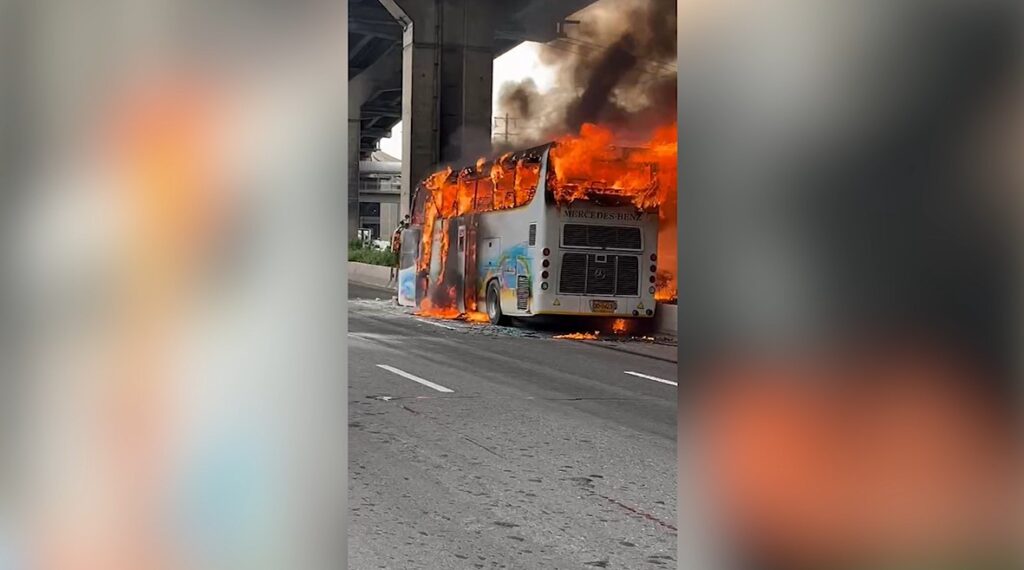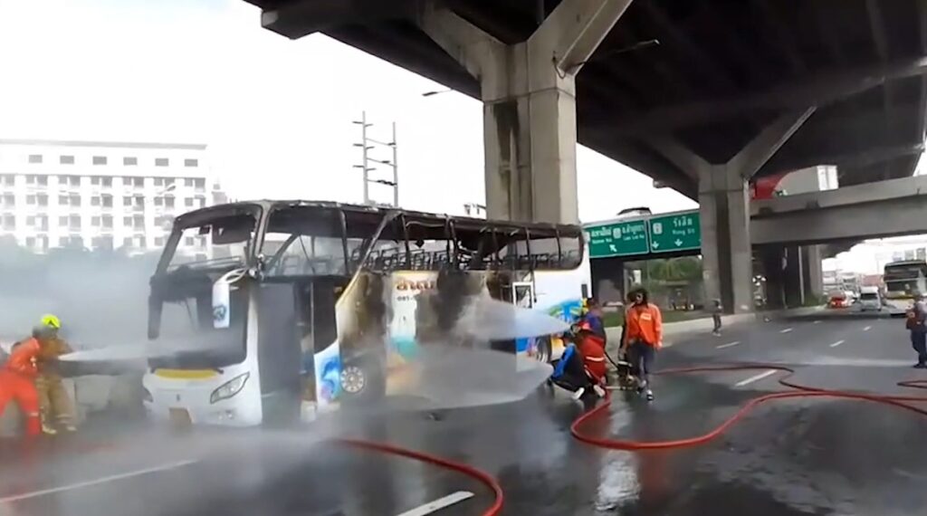 ผ่านไปไม่นาน เพลิงจึงลุกไหม้รถบัสทั้งคัน จนไม่สามารถควบคุมได้ แม้หน่วยดับเพลิงจะพยายามควบคุมไฟที่ลุกไหม้แต่ไม่เป็นผล ใช้เวลาเกือบ 1 ชั่วโมง เพลิงจึงสงบ.-สำนักข่าวไทย