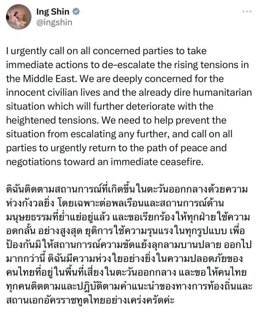 วันนี้ (2 ต.ค.) นางสาวแพทองธาร ชินวัตร นายกรัฐมนตรี โพสต์ข้อความระบุว่า ติดตามสถานการณ์ที่เกิดขึ้นในตะวันออกกลางด้วยความห่วงกังวล โดยเฉพาะต่อพลเรือนและสถานการณ์ด้านมนุษยธรรมที่ย่ำแย่อยู่แล้ว ขอเรียกร้องให้ทุกฝ่ายใช้ความอดกลั้น อย่างสูงสุด ยุติการใช้ความรุนแรงในทุกรูปแบบ เพื่อป้องกันมิให้สถานการณ์ความขัดแย้งลุกลามบานปลายไปมากกว่านี้
