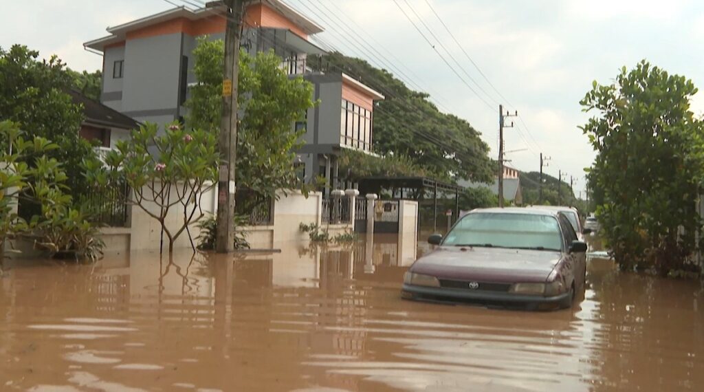 ที่หมู่บ้านจินดาวิลล่า ซึ่งเป็นชุมชนในพื้นที่ลุ่มต่ำ ใกล้ถนนเลียบทางรถไฟ ต.หนองผึ้ง อ.สารภี ถูกน้ำทะลักท่วมมากว่า 3 วันแล้ว หลังรับน้ำที่ท่วมในตัวเมืองเชียงใหม่ จากสภาพตอนนี้บ้านเรือนหลายร้อยหลังยังจมน้ำสูงเกือบ 1 เมตร รถยนต์ รถกระบะ รถมอเตอร์ไซค์ จมน้ำเสียหายหลายสิบคัน แม้ระดับน้ำจะลดลงบ้างแล้วแต่ยังท่วมสูง ต้องใช้เรือสัญจรไปมา โดยชาวบ้านบางส่วนเริ่มพายเรือเข้าไปสำรวจความเสียหายและล้างทำความสะอาดบ้าน