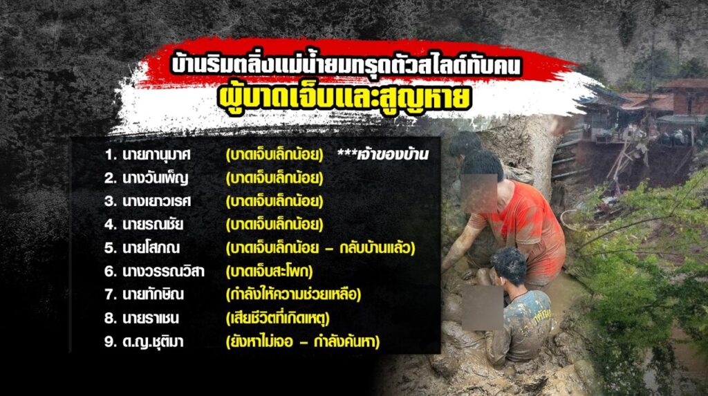 ล่าสุดจากการค้นหา ยังไม่สามารถช่วยเหลือขึ้นมาได้ แต่พบว่า ชาย 2 คน มีผู้เสียชีวิตแล้ว 1 คน ขณะที่อีก 1 คน ยังมีลมหายใจและสติดีอยู่ แต่ยังไม่สามารถขุดดินที่ทับร่างเอาขึ้นมาได้ ในส่วนเด็กหญิง วัย 10 ขวบนั้น ทีมกู้ภัยยังไม่พบร่าง .-สำนักข่าวไทย