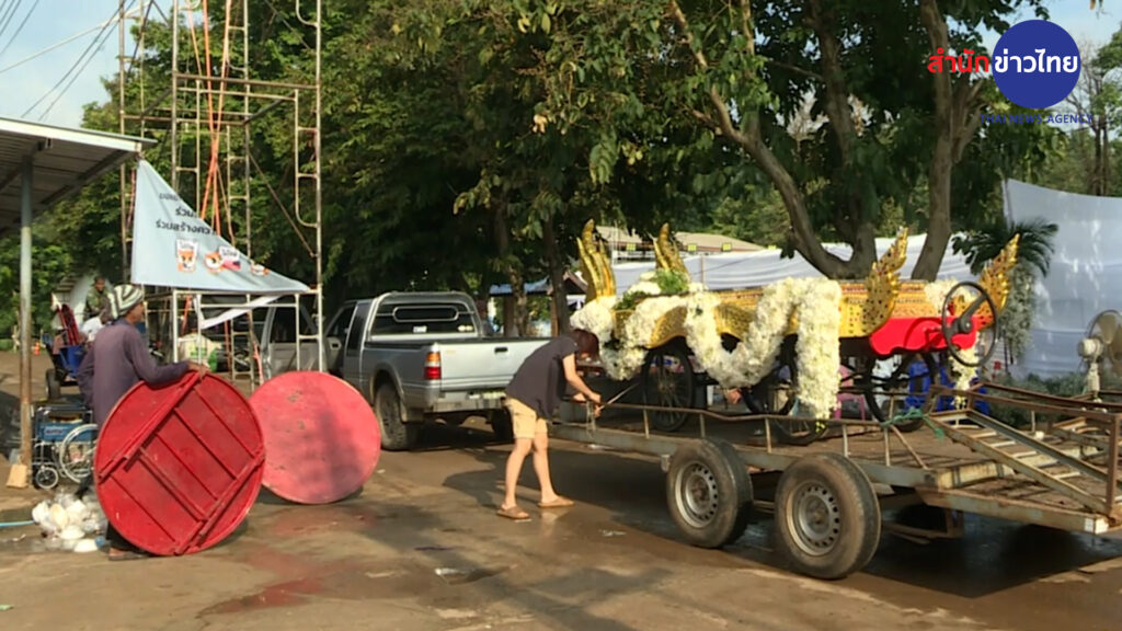 ที่โรงเรียนวัดเขาพระยาสังฆาราม อ.ลานสัก จ.อุทัยธานี เช้าวันนี้ ภายในลานอเนกประสงค์ สถานที่จัดพิธีพระราชทานเพลิงศพวานนี้ เจ้าหน้าที่ที่เกี่ยวข้องทยอยเก็บข้าวของและทำความสะอาดบริเวณงาน