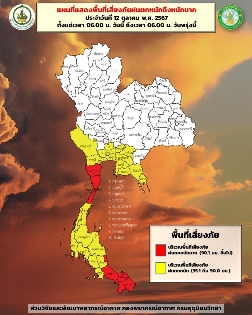 กทม. 12 ต.ค.- กรมอุตุฯ เตือนร่องมรสุมพาดผ่านภาคใต้ตอนบน ทำให้มีฝนตกหนักถึงหนักมากบางแห่ง อาจเกิดน้ำท่วมฉับพลัน-น้ำป่าไหลหลาก