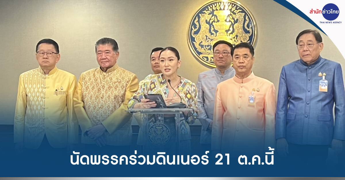 น.ส.แพทองธาร ชินวัตร นายกรัฐมนตรี เปิดเผยว่า ได้นัดพรรคร่วมรัฐบาล รับประทานอาหารในวันที่ 21 ต.ค.นี้ ว่า ตั้งแต่ที่รับตำแหน่งนายกฯ ยังไม่ได้ทานข้าวกับหัวหน้าพรรคร่วมรัฐบาลเลย และมีพรรคร่วมรัฐบาลอีกหลายท่านที่ไม่ได้อยู่ใน ครม. จึงอยากพูดคุยว่าเป็นอย่างไรบ้าง ซึ่งปกติมีวาระสำคัญไม่กี่เรื่อง แต่มาเจอเพื่อพูดคุยกันมากกว่า อัปเดทว่าเกิดอะไรขึ้นบ้าง และจะทำอะไรต่อบ้าง พร้อมขอคอมเมนต์กับสิ่งที่เกิดขึ้น ซึ่งตั้งแต่สมัยนายเศรษฐา ทวีสิน เป็นนายกฯ เราก็จะคุยกันว่าใครมีความคิดเห็นอย่างไร หลายท่านก็มีประสบการณ์มากที่ได้คุย มีเวทีที่สบายๆ ก็จะได้ประโยชน์จากทุกท่านมาก