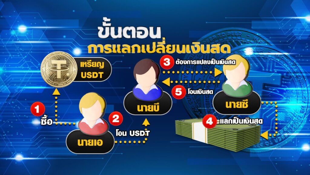 เช่น นายเอ ต้องการส่งเงินให้กับนายบี ก็จะนำเงินสดไปซื้อสินทรัพย์ดิจิทัล เช่นซื้อ USDT จากนั้นโอน USDT ต่อไปให้นายบี หากนายบี ต้องการแปลงเป็นเงินสด ก็จะจ้างนายซี ซึ่งอาจเป็นคนที่อยู่ในต่างประเทศ หรือเป็นชาวต่างประเทศก็ได้ ให้ทำการเทรดแลกเปลี่ยนเป็นเงินสด จากนั้นนายซี ก็จะโยกเงินสดกลับมาให้นายบี ซึ่งอาจจะอยู่ในประเทศไทย หรือนอกประเทศก็ได้ ซึ่งเจ้าหน้าที่จะไม่สามารถตรวจสอบ หรือทราบได้เลยว่านายซีคือใคร วิธีนี้จึงเป็นที่นิยมในกลุ่มวิชาชีพอย่างมากตอนนี้
