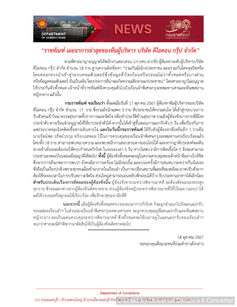 กรมราชทัณฑ์ ขอเรียนว่า ตั้งแต่เมื่อวันที่ 17 ตุลาคม 2567 ผู้ต้องหาทีมผู้บริหารของบริษัท ดิไอคอน กรุ๊ป จำกัด จำนวน 17 ราย ซึ่งรวมถึงนักแสดง 3 ราย ที่ประชาชนให้ความสนใจ ได้เข้าสู่กระบวนการรับตัวคนเข้าใหม่ ตรวจสุขภาพทั้งร่างกายและจิตใจ เพื่อทำประวัติด้านสุขภาพ รวมถึงผู้ต้องขังบางรายที่มีโรคประจำตัว ทางเรือนจำอนุญาตให้ใช้ยาประจำตัวได้ จากนั้นได้เข้าสู่ขั้นตอนการแยกกักตัว 5 วัน เพื่อป้องกันการแพร่ระบาดของโรคติดเชื้อทางเดินหายใจ และในวันที่ 18 ตุลาคม 2567 กรมราชทัณฑ์ ได้รับตัวผู้ต้องหาที่เหลืออีก 1 ราย คือ นายรัตน์พล วรัทย์วรกุล หรือบอสพอล ไว้ในการควบคุมของเรือนจำพิเศษกรุงเทพมหานครเรียบร้อยแล้ว โดยทั้ง 18 ราย สามารถพบทนายความ และพบพนักงานสอบสวนทางออนไลน์ได้ และหากญาติประสงค์จะเดินทางเข้าเยี่ยมจะต้องรอให้ครบกำหนดกักโรค ในระยะเวลา 5 วัน หากไม่พบว่ามีการติดเชื้อใด ๆ จึงจะสามารถประสานลงทะเบียนจองเยี่ยมญาติได้ต่อไป