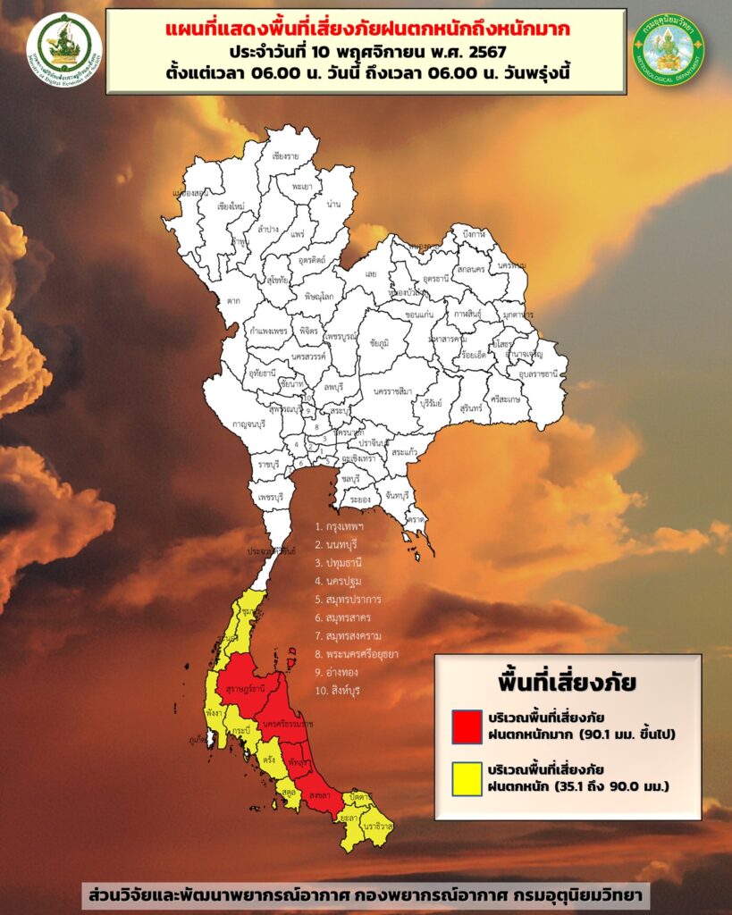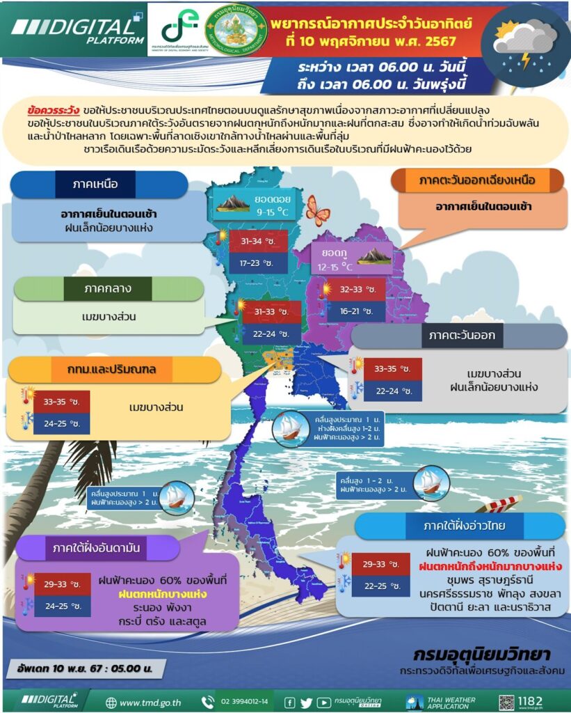 กทม. 10 พ.ย.- กรมอุตุฯ เผย “เหนือ-อีสาน” อากาศเย็นในตอนเช้า เตือนภาคใต้ฝนตกหนักถึงหนักมากบางแห่ง พร้อมอัปเดตเส้นทางพายุ “หยินซิ่ง”