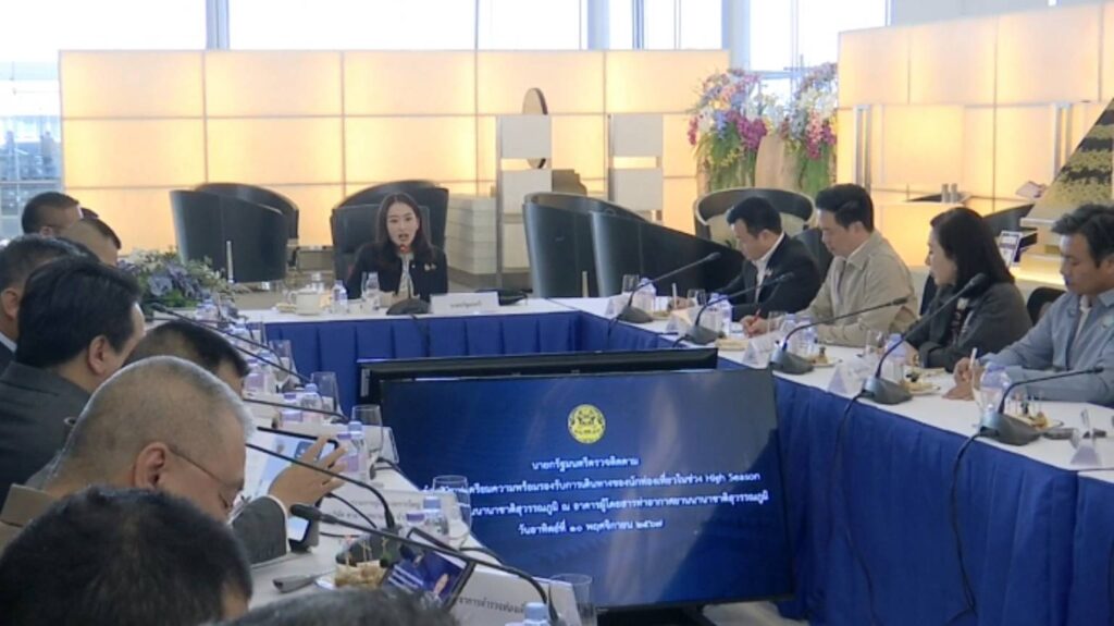 ผู้สื่อข่าวรายงานว่า ก่อนที่นางสาวแพทองธาร ชินวัตร นายกรัฐมนตรี และคณะ เดินทางเยือนนครลอสแอนเจลิส สหรัฐอเมริกา และเข้าร่วมการประชุมผู้นำเขตเศรษฐกิจเอเปก ครั้งที่ 31 และการประชุมอื่น ๆ ที่เกี่ยวข้อง ณ กรุงลิมา สาธารณรัฐเปรู ระหว่างวันที่ 10 – 18 พฤศจิกายน 2567 ได้ประชุมหารือการเตรียมความพร้อมสร้างความเชื่อมั่น และแผนรับนักท่องเที่ยวในช่วง High Season ร่วมกับนายสุริยะ จึงรุ่งเรืองกิจ รองนายกรัฐมนตรีและรัฐมนตรีว่าการกระทรวงคมนาคม นายสรวงศ์ เทียนทอง รัฐมนตรีว่าการกระทรวงการท่องเที่ยวและกีฬา ผู้บัญชาการตำรวจสำนักงานตรวจคนเข้าเมือง ผู้บัญชาการตำรวจท่องเที่ยว และผู้อำนวยการท่าอากาศยานสุวรรณภูมิ ที่ท่าอากาศยานนานาชาติสุวรรณภูมิ