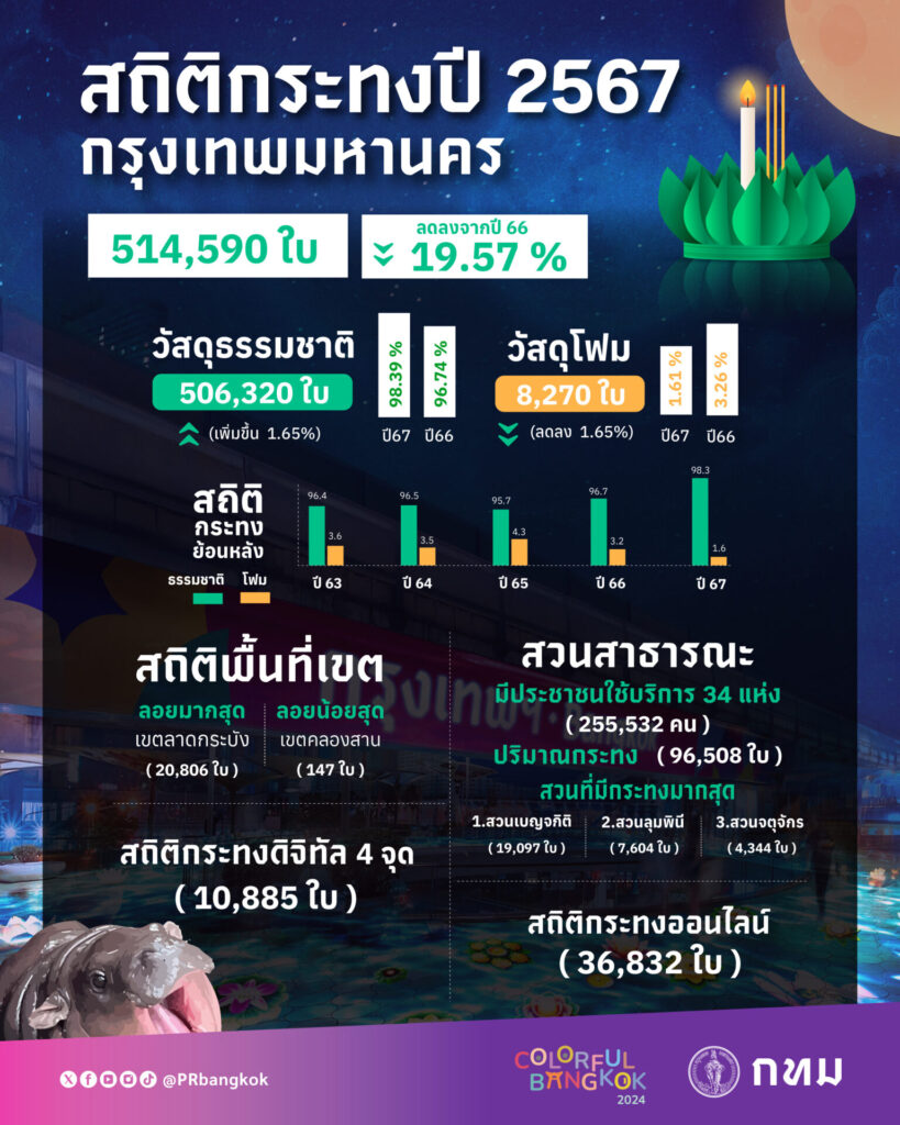 สำหรับในปี 2567 กรุงเทพมหานคร จัดเก็บกระทงได้จำนวนทั้งสิ้น 514,590 ใบ เป็นกระทงที่ทำจากวัสดุธรรมชาติ จำนวน 506,320 ใบ คิดเป็นร้อยละ 98.39 กระทงที่ทำจากโฟม จำนวน 8,270 ใบ คิดเป็นร้อยละ 1.61 สำหรับจำนวนกระทงทั้งหมดลดลงจากปีก่อน 125,238 ใบ คิดเป็นร้อยละ 19.57 โดยสถิติปี 2566 จัดเก็บกระทงได้ 639,828 ใบ เป็นกระทงที่ทำจากวัสดุธรรมชาติ 618,951 ใบ และกระทงโฟม 20,877 ใบ ในส่วนของการลอยกระทงออนไลน์ ซึ่งเป็นปีแรกที่กรุงเทพมหานครเชิญชวนประชาชนลอยกระทงออนไลน์ผ่านทางเว็บไซต์ในบรรยากาศเสมือนจริงของสวนสาธารณะของกรุงเทพมหานคร ทั้ง 34 แห่ง และริมแม่น้ำเจ้าพระยาที่ไอคอนสยาม มีประชาชนร่วมลอยกระทง จำนวน 36,832 ใบ ส่วนการลอยกระทงดิจิทัลในพื้นที่ 4 จุด มีจำนวน 10,885 ใบ