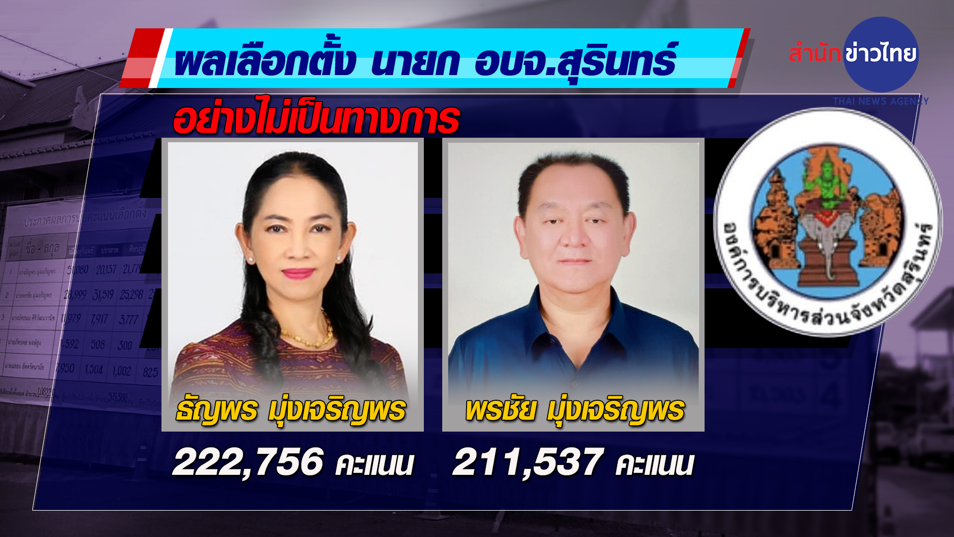 สรุปผลการนับคะแนนการเลือกตั้งนายก อบจ.สุรินทร์ อย่างไม่เป็นทางการ เมื่อเวลา 01.00 น. นับครบ 2326 หน่วย ปรากฏว่า