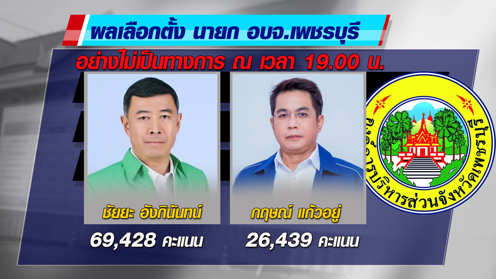 เพชรบุรี 24 พ.ย. – เลือกตั้งนายก อบจ.เพชรบุรี ไม่คึกคัก ผลไม่เป็นทางการ “ชัยยะ อังกินันทน์” แชมป์เก่า คะแนนนำทิ้งห่างคู่แข่ง ด้านเลขาฯ กกต. เผยภาพรวมทั้ง 3 จังหวัด คนมาใช้สิทธิน้อย คาดเบื่อเลือกตั้ง 2 รอบ