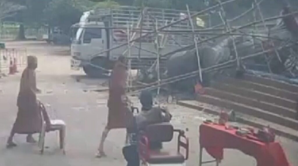 ภาพจากกล้องวงจรปิดเผยนาทีพระประธานขนาดใหญ่ปางลีลาความสูง 9 เมตร ที่อยู่ระหว่างแกะแบบ พังถล่มทับพระมรณภาพ 1 รูป และพระเณรบาดเจ็บอีก 3 รูป เหตุเกิดที่สำนักสงฆ์แห่งหนึ่ง ริมแม่น้ำโขง อ.ชานุมาน จ.อำนาจเจริญ