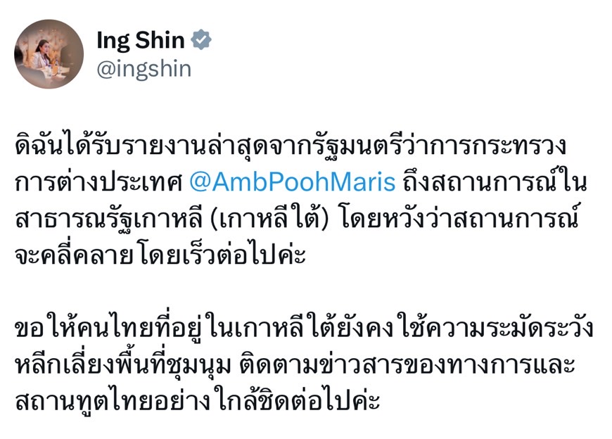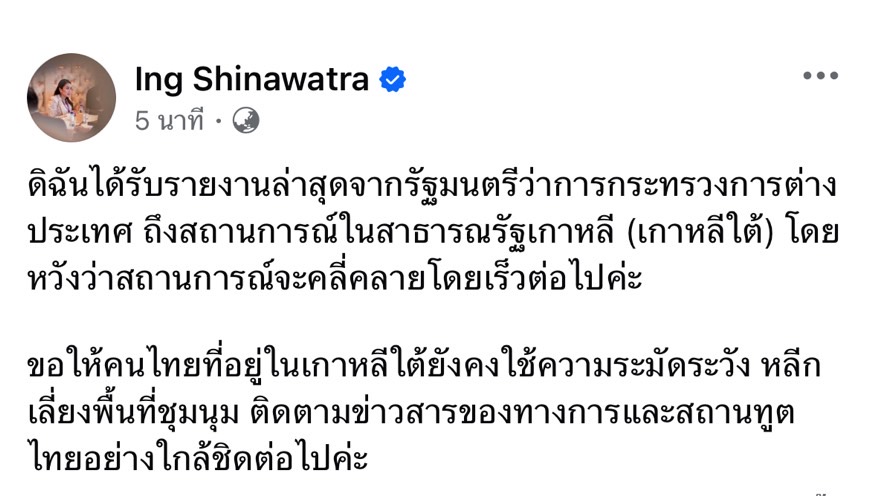น.ส.แพทองธาร ชินวัตร นายกรัฐมนตรี ทวิตข้อความผ่าน X และโพสต์ข้อความผ่านเฟซบุ๊ก เกี่ยวกับสถานการณ์ในประเทศเกาหลีใต้ โดยมีข้อความระบุว่า ได้รับรายงานล่าสุดจากรัฐมนตรีว่าการกระทรวงการต่างประเทศ @AmbPoohMaris ถึงสถานการณ์ในสาธารณรัฐเกาหลี (เกาหลีใต้) โดยหวังว่าสถานการณ์จะคลี่คลายโดยเร็วต่อไป