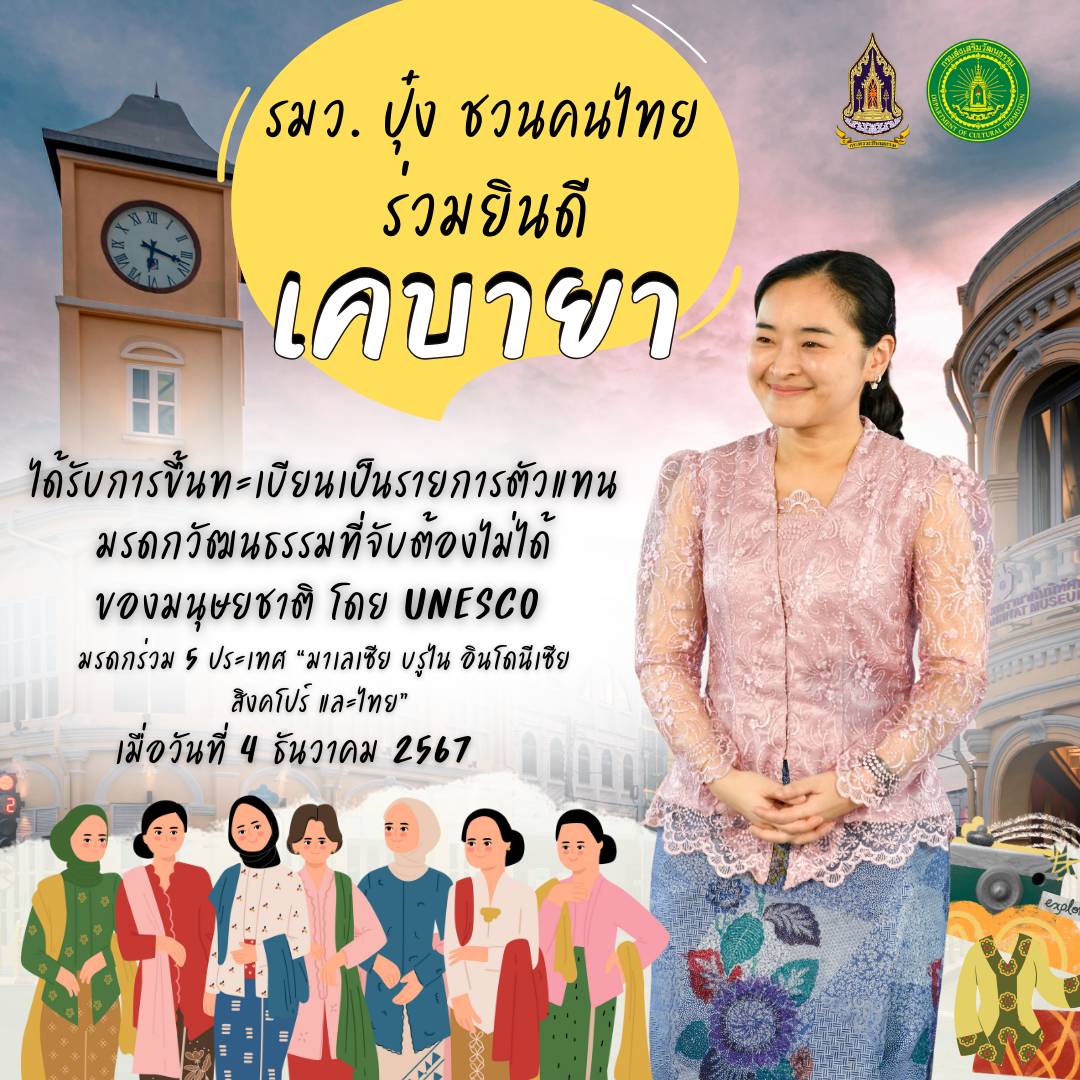นางสาวสุดาวรรณ หวังศุภกิจโกศล รัฐมนตรีว่าการกระทรวงวัฒนธรรม (รมว.วธ.) เปิดเผยว่า ที่ประชุมคณะกรรมการระหว่างรัฐบาลเพื่อการสงวนรักษามรดกวัฒนธรรมที่จับต้องไม่ได้ ครั้งที่ 19 (The nineteenth session of the Intergovernmental Committee for the Safeguarding of the Intangible Cultural Heritage: IGC-ICH) ขององค์การการศึกษา วิทยาศาสตร์และวัฒนธรรมแห่งสหประชาชาติ หรือ UNESCO ในวันที่ 4 ธันวาคม 2567 เวลา ประมาณ 09.30 – 12.30 น. (เวลาท้องถิ่น) สาธารณรัฐปารากวัย หรือตรงกับวันที่ 4 ธันวาคม 2567 ระหว่างเวลา 19.30 – 22.30 น. (เวลาประเทศไทย) ยูเนสโก มีมติรับรองให้ Kebaya : knowledge, skills, tradition and practices หรือ เคบายา : ความรู้ ทักษะ ประเพณี และการปฏิบัติ ซึ่งเป็นการเสนอร่วม 5 ประเทศ คือ บรูไน อินโดนีเซีย มาเลเซีย สิงคโปร์ และไทย ขึ้นทะเบียนเป็นรายการตัวแทนมรดกวัฒนธรรมที่จับต้องไม่ได้ของมนุษยชาติ (Representative List of the Intangible Cultural Heritage of Humanity: RL) ประจำปี 2567 อีกด้วย จึงเป็นเรื่องที่น่ายินดีเป็นอย่างยิ่งที่ “เคบายา” เครื่องแต่งกายอันสง่างามของทางใต้ ได้รับการขึ้นทะเบียนในปีเดียวกันต่อจาก “ต้มยำกุ้ง” ถือเป็นรายการมรดกวัฒนธรรมฯ ลำดับที่ 6 ของประเทศไทย ต่อจากรายการ โขน นวดไทย โนรา สงกรานต์ และต้มยำกุ้ง