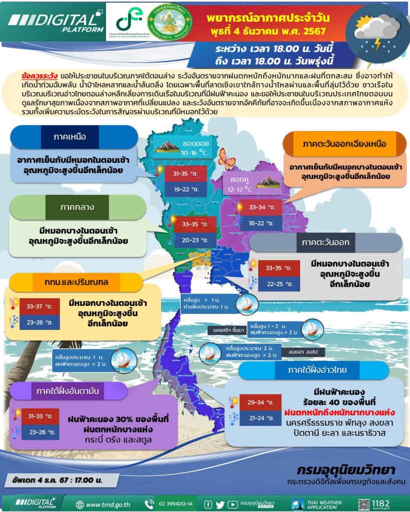กทม. 5 ธ.ค.- กรมอุตุฯ เผยไทยตอนบนยังคงมีอากาศเย็นในตอนเช้า ยอดดอยอุณหภูมิต่ำสุด 10 องศาฯ ส่วนภาคใต้ตอนล่างฝนตกหนักบางแห่ง