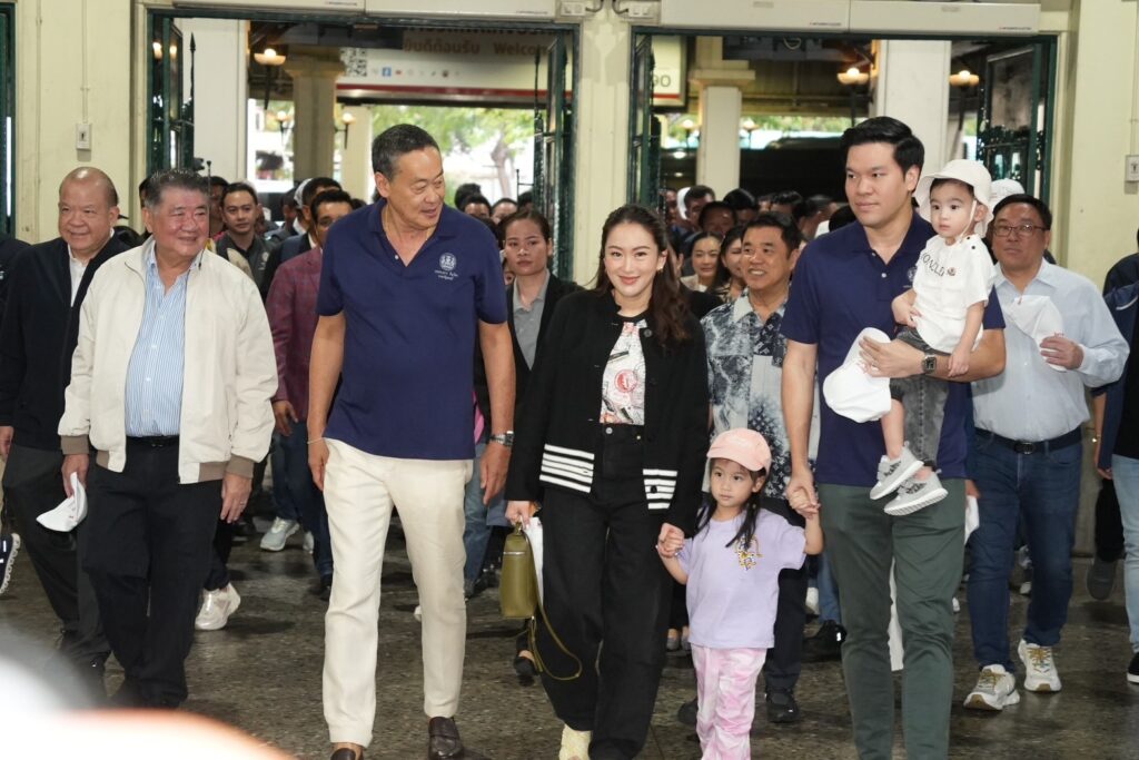 ต่อมาในเวลา 08.00 น. นายกรัฐมนตรี เดินทางถึงสถานีรถไฟหัวลำโพง ซึ่งมาพร้อมด้วยนายปิฎก สุขสวัสดิ์ สามี และน้องธิธาร สุขสวัสดิ์ ลูกสาว และน้องธาษิณ พฤจ์ธาษิณ สุขสวัสดิ์ ลูกชาย รวมไปถึงครอบครัว “ชินวัตร” อาทิ นายพานทองแท้ ชินวัตร และหลานๆ รวม 7 คน ร่วมขบวนด้วย