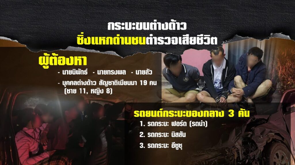 ขณะที่กระบะ 4 ประตู ทะเบียนอุตรดิตถ์ ของนายทรงพล ไม่ยอมหยุดรถ และพุ่งชนรถตำรวจที่จอดอยู่อย่างจัง ทำให้ตำรวจที่อยู่บริเวณดังกล่าวกระโดดหลบกันจ้าละหวั่น แต่ท้ายรถได้ฟาดร่างของ ส.ต.ท.ณัฐวัฒน์ ภวัตรัชต์พงษ์ หรือ หมู่อาร์ม ที่ยืนปฏิบัติหน้าที่กระเด็นไปฟาดกับเสาไฟส่องสว่างข้างทางเสียชีวิตคาที่ ส่วนคนขับรถ กระโดดออกจากรถ และวิ่งหนีเข้าไปในป่าอ้อยข้างทาง ตำรวจจึงปิดล้อมและจับกุมตัวได้ในที่สุด ขณะที่นายทรงพลได้โทรตามนายนิพัทธ์ พี่ชายที่ขับรถนำทางว่ารถของตนตกถนน นายนิพัทธ์จึงขับรถวนกลับมาดู และถูกจับกุมได้ทั้งหมด โดยรถทั้ง 3 คัน ขนแรงงานต่างด้าวชาวเมียนมามาทั้งหมด 19 คน เป็นชาย 11 คน หญิง 8 คน