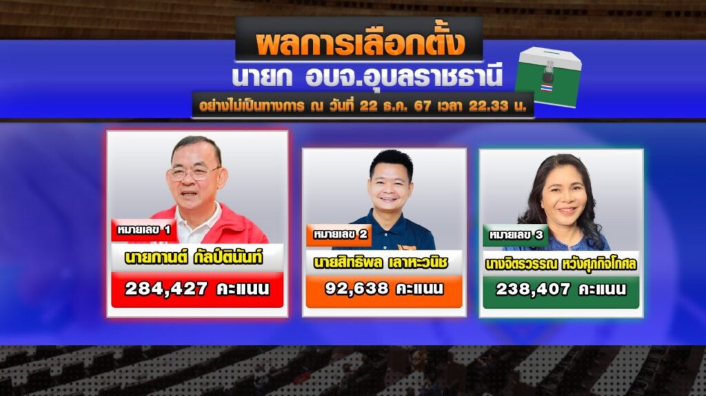 ทั้งนี้การนับคะแนนการเลือกตั้งนายก อบจ.อุบลราชธานี คะแนนอย่างไม่เป็นทางการ เมื่อเวลา 22.33 น. ดังนี้ หมายเลข 1 กานต์ กัลป์ตินันท์ ได้คะแนน 284,427 หมายเลข 2 นายสิทธิพล เลาหะวนิช ได้คะแนน 92,638 และหมายเลข 3 จิตรวรรณ หวังศุภกิจโกศล ได้คะแนน 238,407