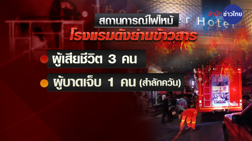 กทม. 30 ธ.ค.- ระทึกกลางดึก! ไฟไหม้โรงแรมแห่งหนึ่งย่านถนนข้าวสาร เจ้าหน้าที่เข้าสกัดเพลิงและเร่งช่วยเหลือผู้ที่ติดค้างอยู่ภายใน เบื้องต้นมีผู้เสียชีวิต 3 ราย