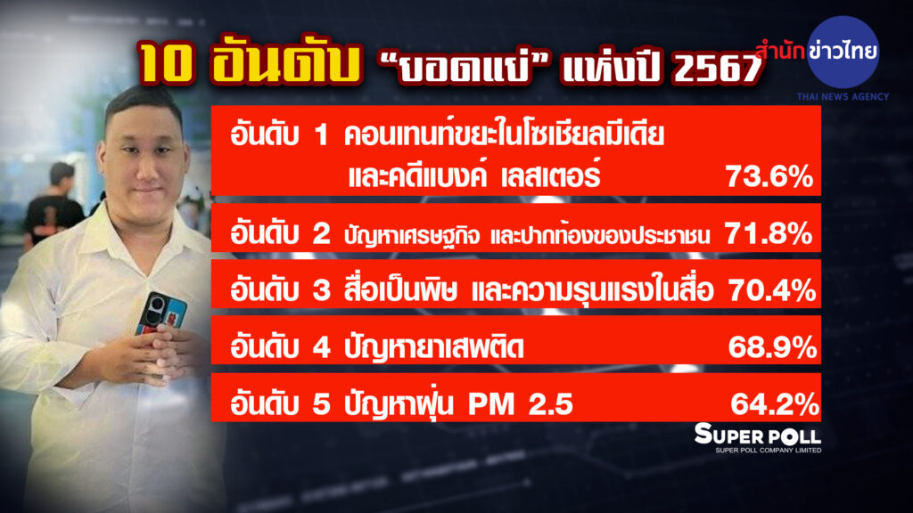 1 ม.ค.- ซูเปอร์โพล เปิดผลสำรวจ 10 อันดับอะไรยอดฮิต – อะไรยอดแย่ แห่งปี 2567 มาดูกันว่าปีที่ผ่านมา มีอะไรที่ฮิตสุดๆ และมีอะไรที่ถูกจดจำในทางลบบ้าง