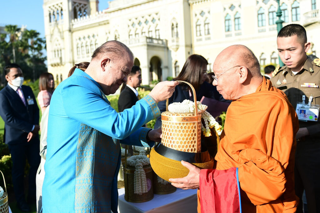 ก่อนที่นายกรัฐมนตรี พร้อมคู่สมรส จะนำคณะรัฐมนตรีและคู่สมรส ร่วมทำบุญตักบาตร พระสงฆ์ 58 รูป จากวัดโมลีโลกยาราม บริเวณรอบสนามหญ้าหน้าตึกไทยคู่ฟ้า ซึ่งรวมพระสงฆ์ที่มาร่วมพิธีในวันนี้(2 ม.ค.) จำนวน 68 รูป