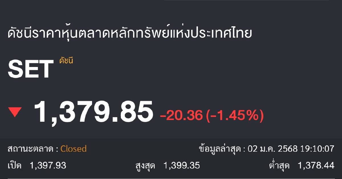 กรุงเทพฯ 2 ม.ค.-ดัชนี SET วันแรกของการซื้อขายปี 2568 ปิดที่ 1,379.85 จุด ปรับตัวลดลง 20.36 จุด หรือ 1.45% มูลค่าการซื้อขาย 36,852.83 ล้านบาท ตลาดกังวลนโยบายการค้าระหว่างประเทศ-นโยบายภาษี
