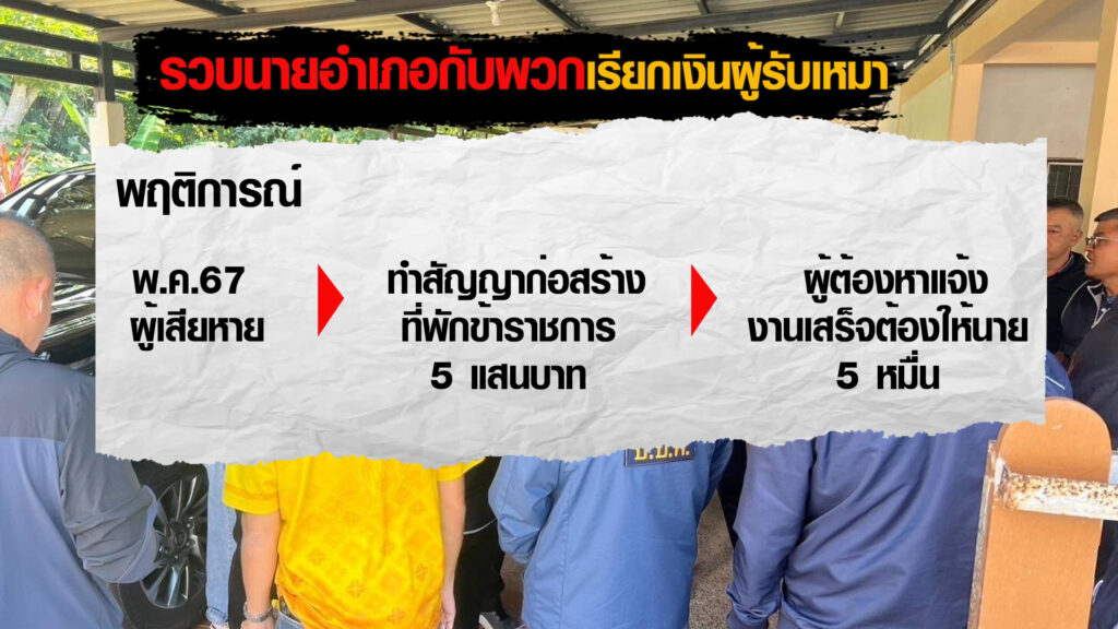 เรื่องนี้เกิดขึ้นเมื่อประมาณเดือนพฤษภาคม 2567 ผู้เสียหายได้ทำสัญญาก่อสร้างโครงการปรับปรุงซ่อมแซมอาคารที่พักข้าราชการ ราคาจ้างเหมา 500,000 บาท โดยมีนายอำเภอเหนือคลอง เป็นผู้ลงนามว่าจ้างโครงการ ต่อมาช่วงต้นเดือนมิถุนายน 2567 นายอำเภอเหนือคลองได้มาพูดคุยเกี่ยวกับงานที่กำลังก่อสร้างตามสัญญาจ้างกับผู้เสียหาย และแจ้งว่า “หากเสร็จงานแล้ว ผู้เสียหายต้องให้นาย 50,000 บาท”