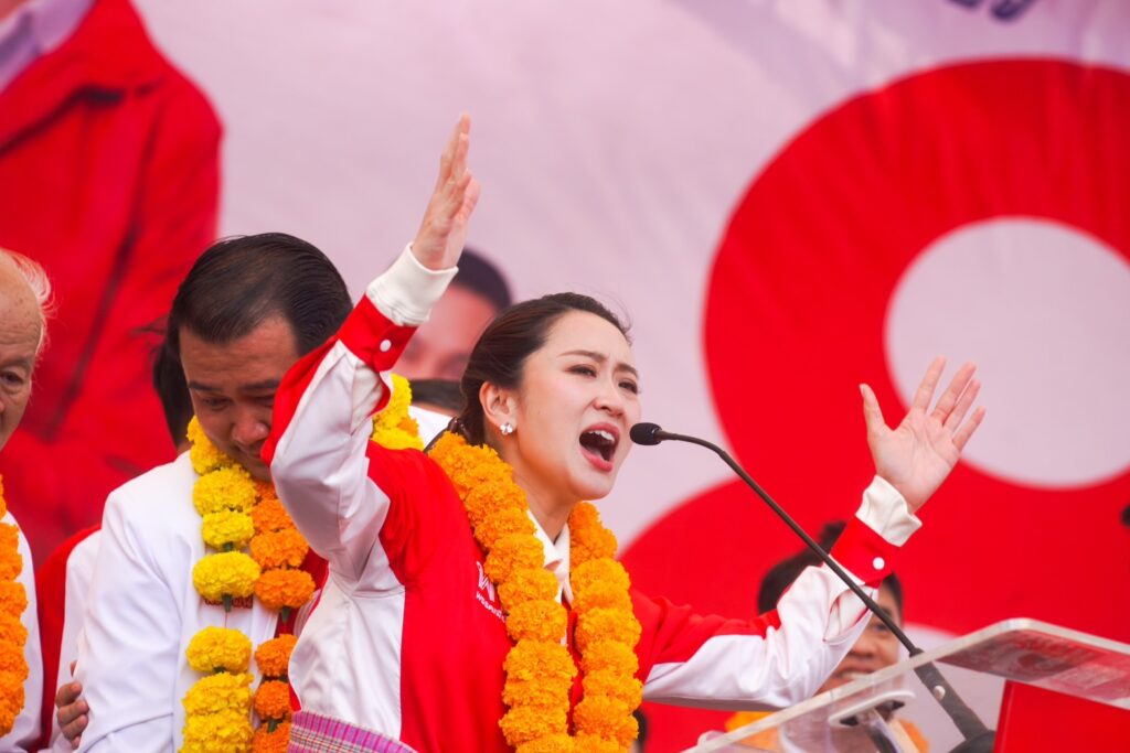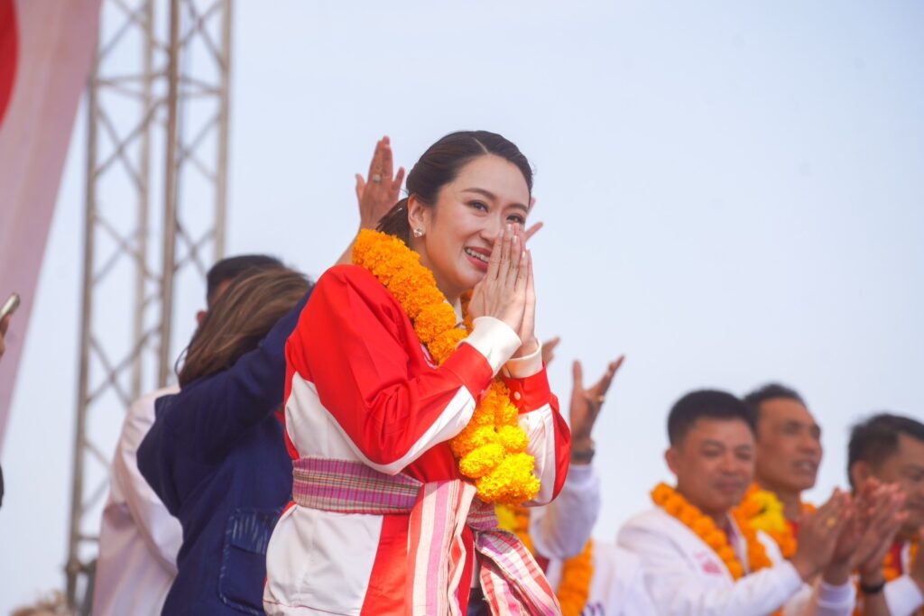 โดยทันทีที่มาถึงประชาชนที่รอรับฟังคำปราศรัยจำนวนมาก ได้ตะโกนต้อนรับและโบกธงผู้สมัคร พร้อมกรูกันมาคล้องพวงมาลัยดอกดาวเรือง มอบดอกกุหลาบและผูกผ้าขาวม้าที่เอว เป็นการต้อนรับ จนทำให้ น.ส.แพทองธาร ต้องค่อยๆ เดินแหวกฝูงชนมายังเวทีปราศรัย