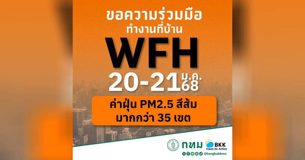 จึงประกาศ WFH ในวันที่ 20-21 ม.ค.68 ซึ่งยังคงต้องเฝ้าติดตามสถานการณ์อย่างใกล้ชิด หากพบว่าฝุ่น PM 2.5 ยังคงมีแนวโน้มสูงขึ้นต่อเนื่อง จะประกาศ WFH ต่อไปจนถึงวันที่ 24 ม.ค.68 โดยได้มีการสื่อสารประชาสัมพันธ์ให้กับภาคีเครือข่าย WFH รับทราบล่วงหน้า เพื่อให้สามารถวางแผนการทำงานล่วงหน้า และลดผลกระทบกับหน่วยงานภาคส่วนต่าง ๆ ที่เข้าร่วม