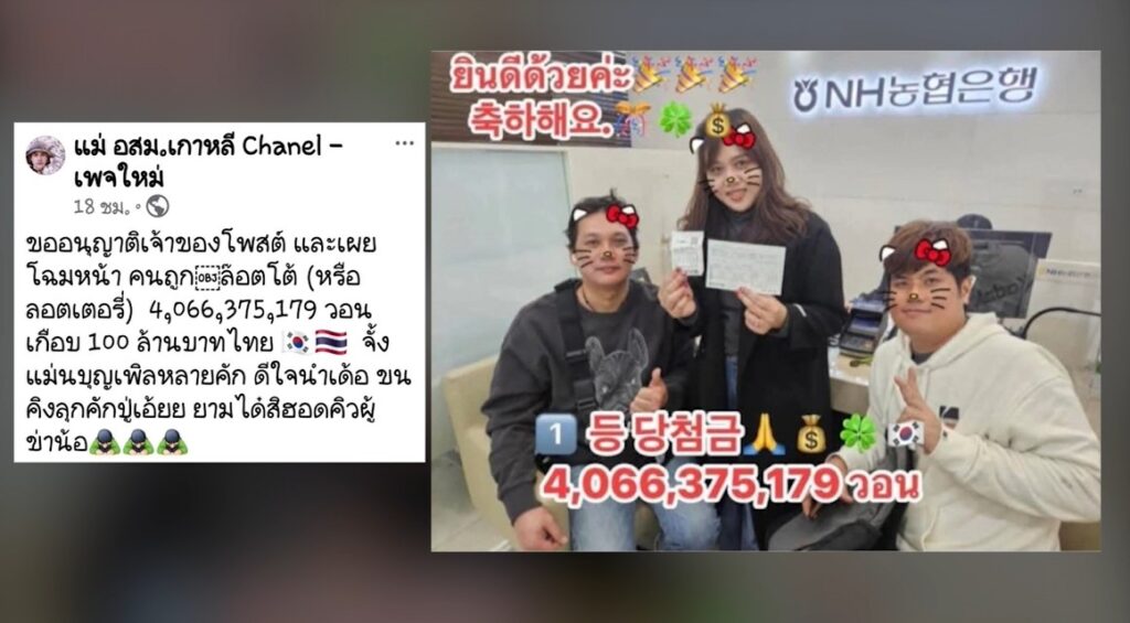 เพจเฟซบุ๊กของคนไทยในเกาหลีใต้ โพสต์แสดงความยินดีกับนายสุเมธศักดิ์ หรือ หนุ่ย อายุ 42 ปี หนุ่มแรงงานโรงงานในประเทศเกาหลีใต้ ถูกลอตเตอรี่ 4,066,375,179 วอน (4,000 ล้านวอน) หรือประมาณ 96 ล้านบาท โดยแบ่งกับเพื่อนคนละครึ่ง หลังจากเสียภาษีน่าจะอยู่ที่ราว 45 ล้านบาท