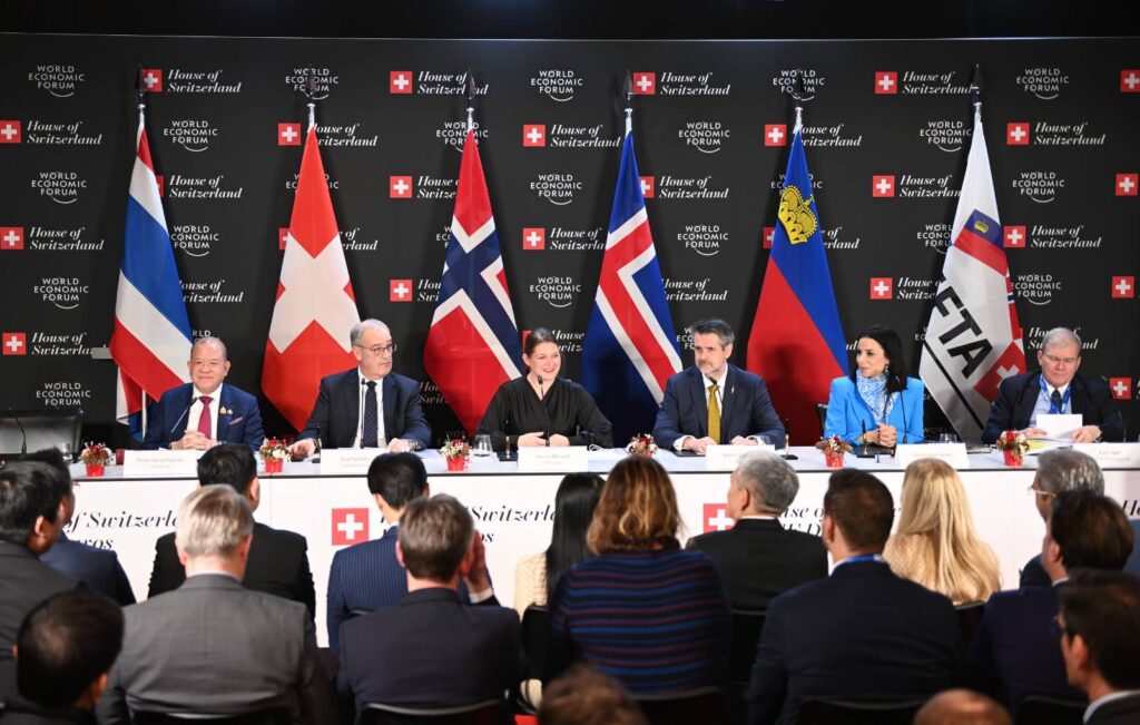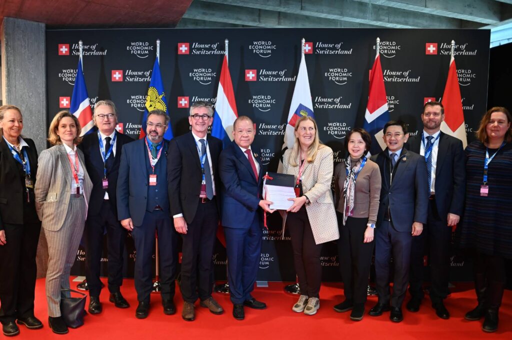นายพิชัย นริพทะพันธุ์ รัฐมนตรีว่าการกระทรวงพาณิชย์ ให้สัมภาษณ์ภายหลังร่วมลงนามความตกลงการค้าเสรี (Free Trade Agreement : FTA) ระหว่างไทย กับ “เอฟตา” หรือ สมาคมการค้าเสรีแห่งยุโรป (European Free Trade Associations : EFTA) พร้อมกับรัฐมนตรีกระทรวงเศรษฐกิจสวิตเซอร์แลนด์ (นายกี ปาร์เมอแล็ง) รัฐมนตรีกระทรวงการค้าและอุตสาหกรรมนอร์เวย์ (ซิซีลี เมียร์เซ็ท) รัฐมนตรีกระทรวงการต่างประเทศลิกเตนสไตน์ (โดมินิค แฮชเลอร์)และปลัดกระทรวงการต่างประเทศไอซ์แลนด์ (มาร์ติน เอยอบสัน) โดยมีนายกรัฐมนตรีของไทย (นางสาวแพทองธาร ชินวัตร) และเลขาธิการเอฟตา (เคิร์ท เจเกอร์) ร่วมเป็นสักขีพยาน ที่ House of Switzerland เมืองดาวอส สมาพันธรัฐสวิส ซึ่งเป็น FTA ฉบับแรกของไทยกับยุโรป ที่ได้เจรจามา 2 ปี และรัฐบาลนี้ได้หาข้อสรุปร่วมกับเอฟตาจนการเจรจาประสบความสำเร็จใน 3 เดือน