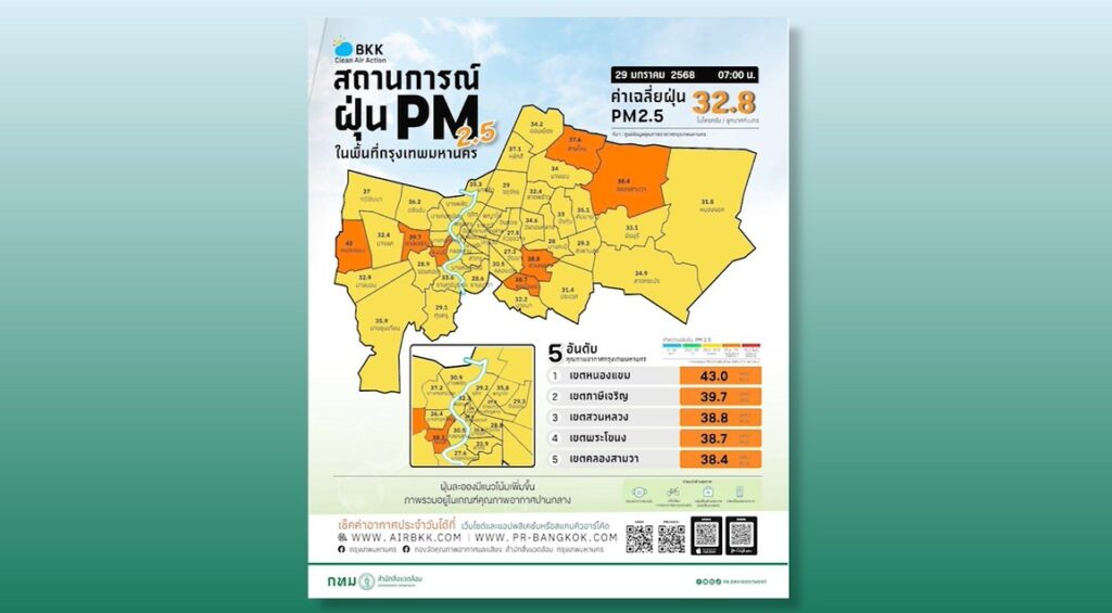 กรุงเทพฯ 29 ม.ค. – สถานการณ์ฝุ่นเช้าวันนี้ (29 ม.ค.) ในพื้นที่ กทม. กลับมามีส้มอีกครั้งใน 7 เขต หลังดีขึ้นเมื่อช่วง 2-3 วันที่ผ่านมา ส่วนทั่วประเทศพบเกินมาตรฐาน 15 จังหวัด และมีแนวโน้มเพิ่มขึ้นอีก